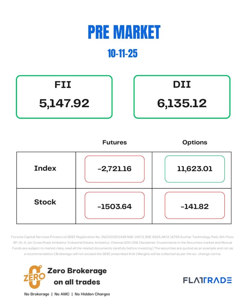 Gift Nifty is trading lower at around 25,560.50, indicating a flat to negative start on November 10.