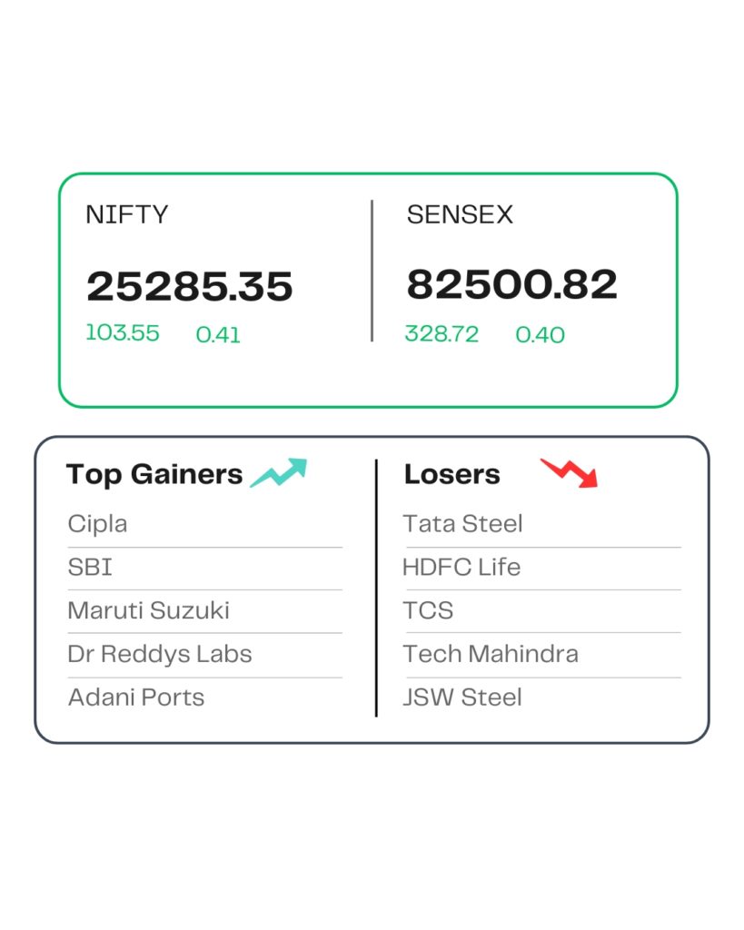 At close, the Sensex was up 328.72 points or 0.40 percent at 82,500.82, and the Nifty was up 103.55 points or 0.41 percent at 25,285.35. About 2334 shares advanced, 1657 shares declined, and 154 shares remained unchanged.