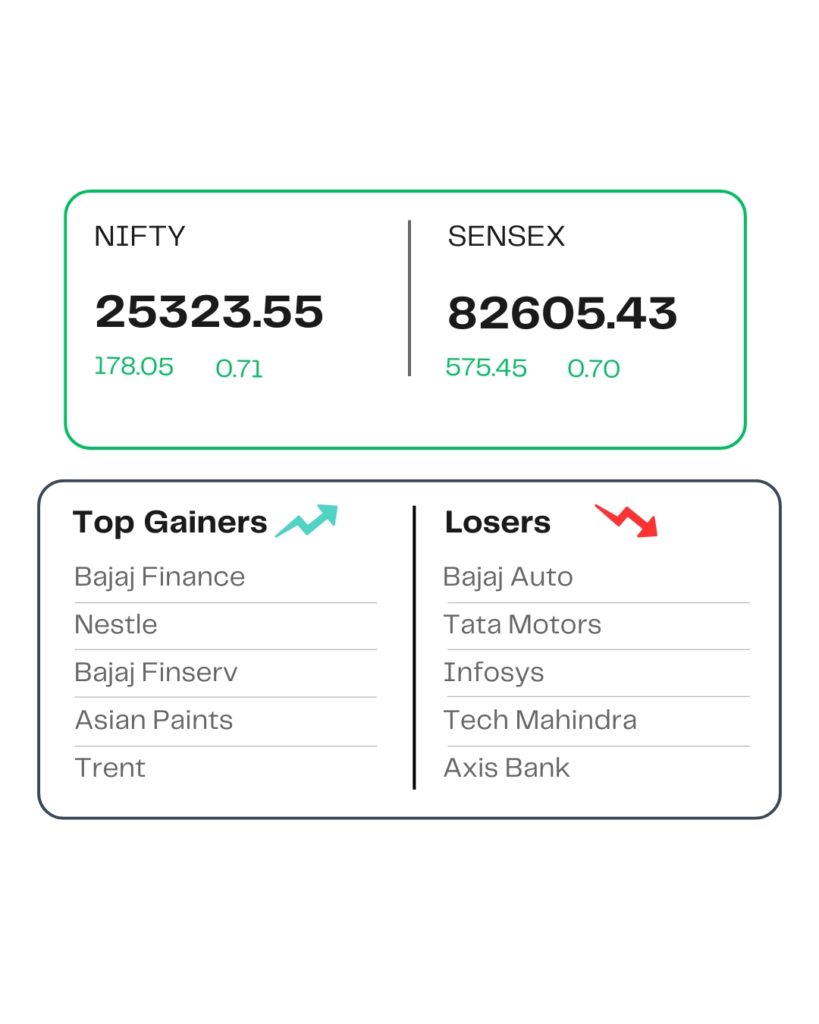 The biggest Nifty gainers were Bajaj Finserv, Bajaj Finance, Trent, Nestle India, and Asian Paints, while the losers were Infosys, Tata Motors, Bajaj Auto, Tech Mahindra, and Axis Bank.