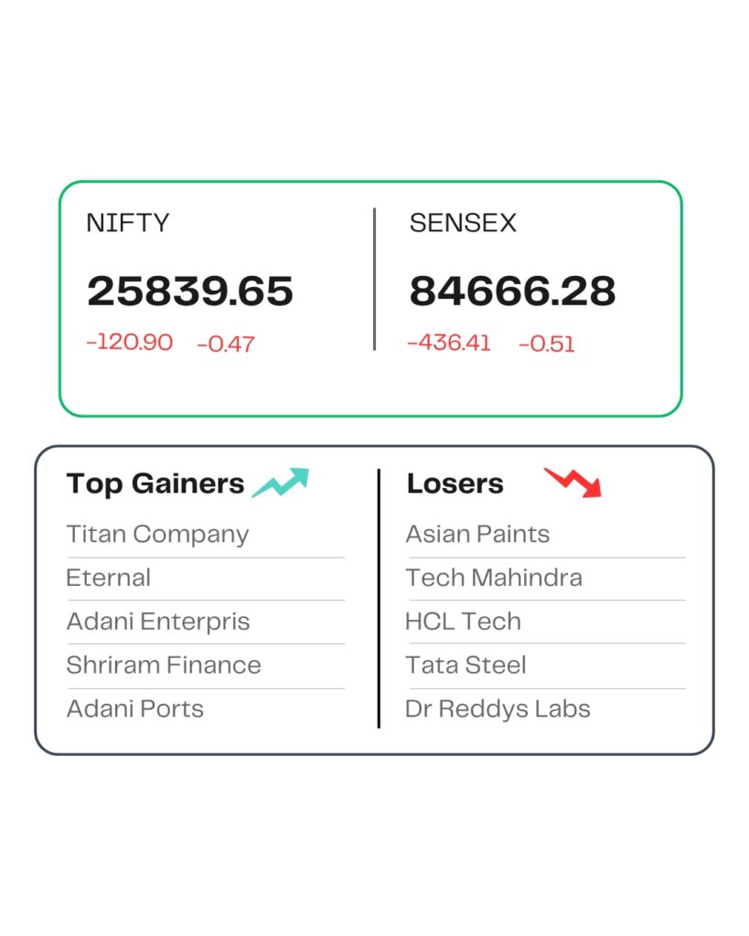 At close, the Sensex was down 436.41 points or 0.51 percent at 84,666.28, and the Nifty was down 120.9 points or 0.47 percent at 25,839.65. About 2403 shares advanced, 1455 shares declined, and 127 shares were unchanged.