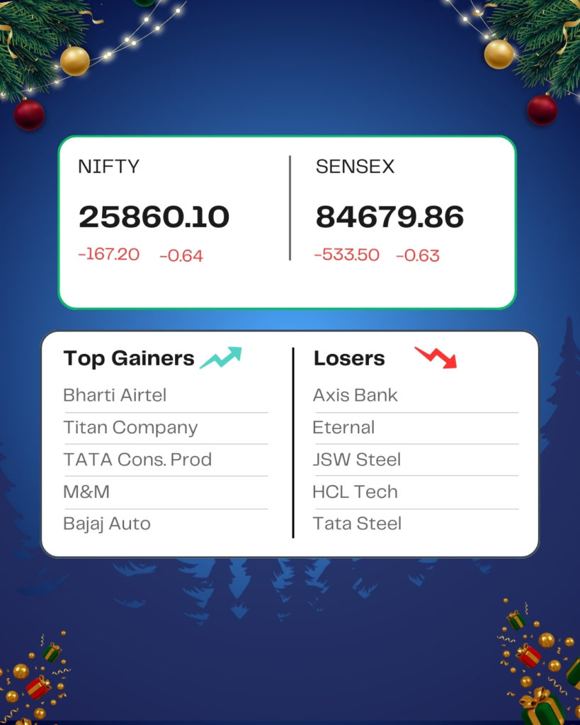Axis Bank, Eternal, HCL Technologies, Tata Steel, JSW Steel were among the major losers on the Nifty, while gainers were Bharti Airtel, Tata Consumer, Titan Company, M&M, Bajaj Auto.