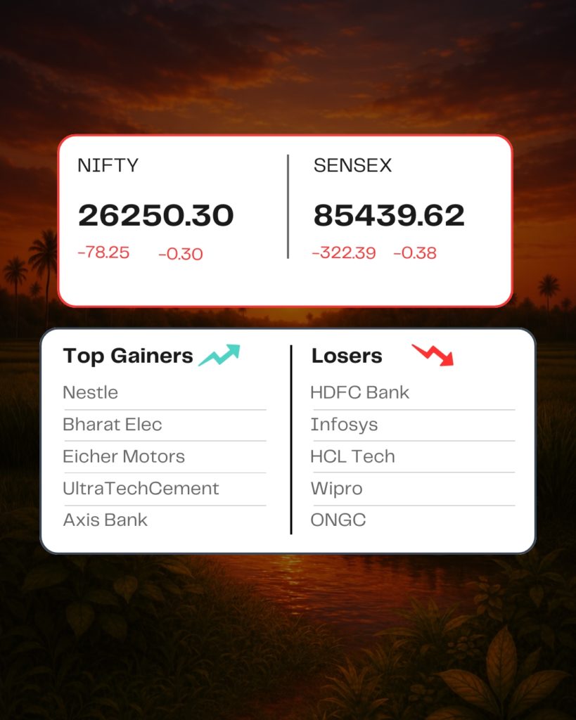 At close, the Sensex was down 322.39 points or 0.38 percent at 85,439.62, and the Nifty was down 78.25 points or 0.30 percent at 26,250.30.