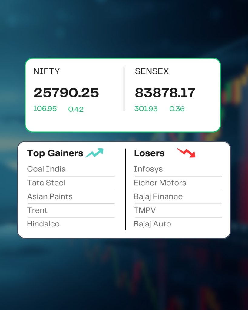 At close, the Sensex was up 301.93 points or 0.36 percent at 83,878.17, and the Nifty was up 106.95 points or 0.42 percent at 25,790.25. About 1365 shares advanced, 2561 shares declined, and 158 shares were unchanged