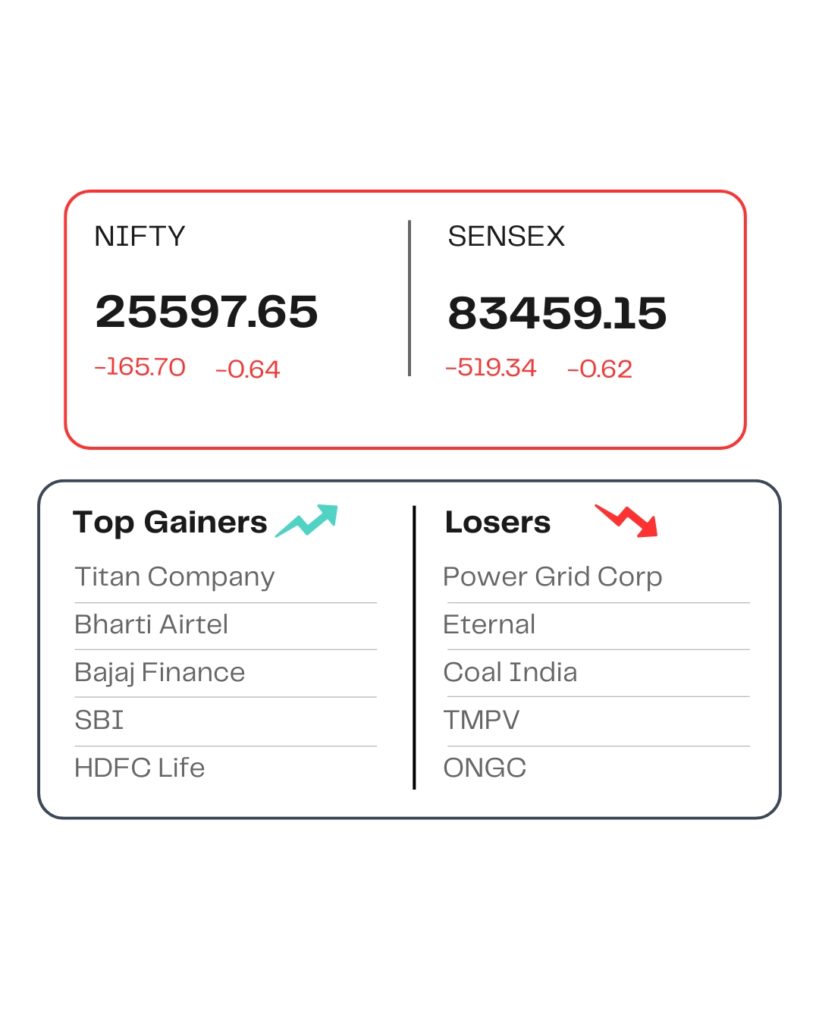 At close, the Sensex was down 519.34 points or 0.62 percent at 83,459.15, and the Nifty was down 165.70 points or 0.64 percent at 25,597.65. About 1543 shares advanced, 2439 shares declined, and 152 shares were unchanged.