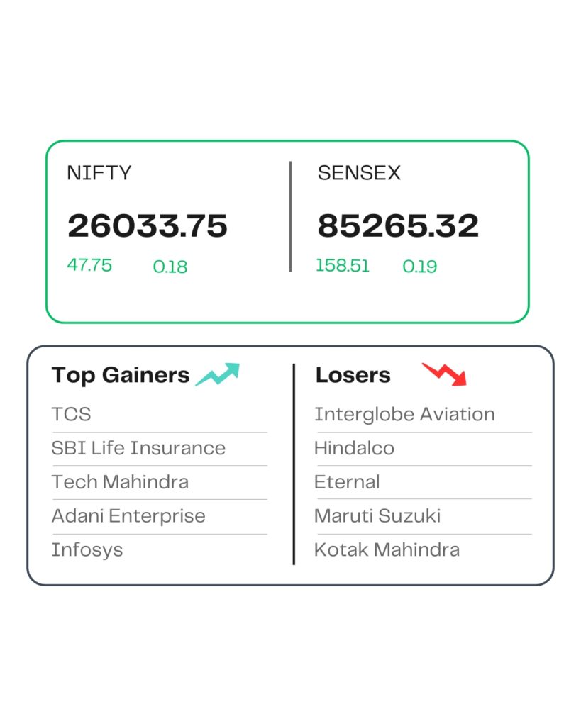 Sensex closed 158.51 points or 0.19 percent higher at 85,265.32, and the Nifty ended 47.75 points or 0.18 percent higher at 26,033.75. About 1,716 shares advanced, 2,237 shares declined, and 166 shares were unchanged.