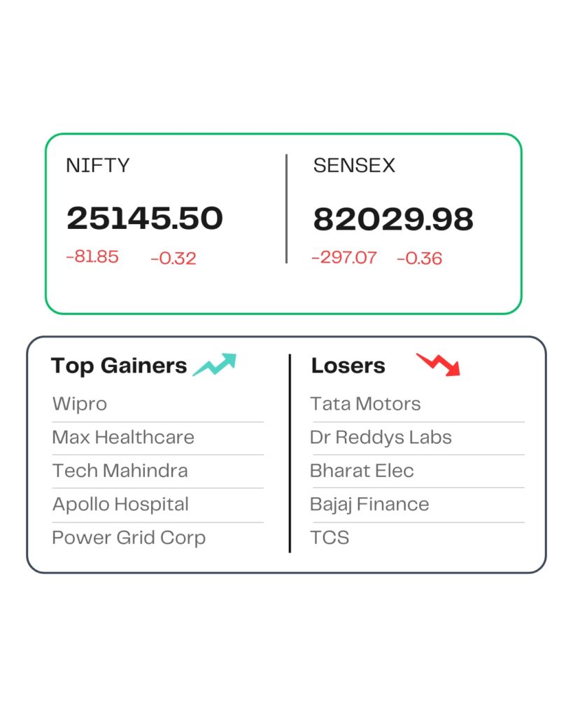 At close, the Sensex was down 297.07 points or 0.36 percent at 82,029.98, and the Nifty was down 81.85 points or 0.32 percent at 25,145.50. About 1140 shares advanced, 2692 shares declined, and 97 shares were unchanged.
