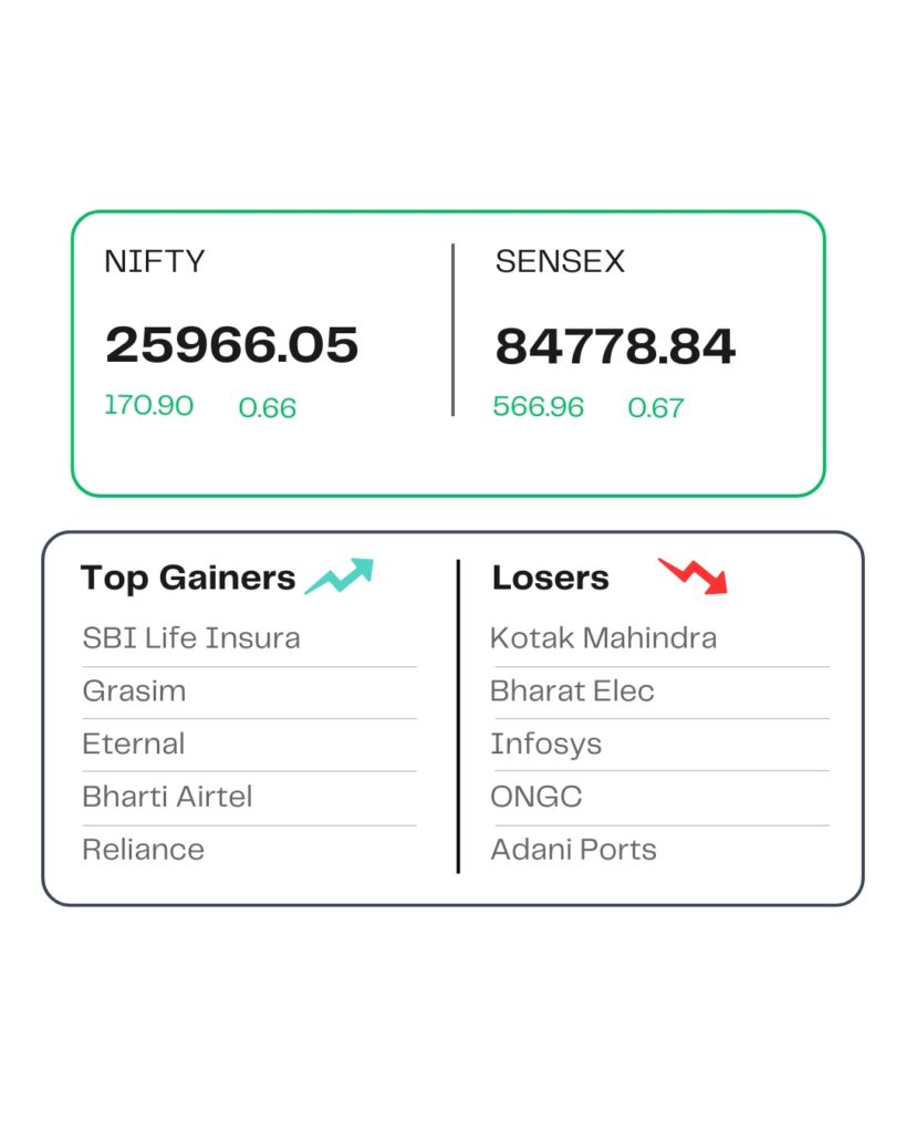 At close, the Sensex was up 566.96 points or 0.67 percent at 84,778.84, and the Nifty was up 170.9 points or 0.66 percent at 25,966.05. About 1925 shares advanced, 1994 shares declined, and 155 shares remained unchanged.