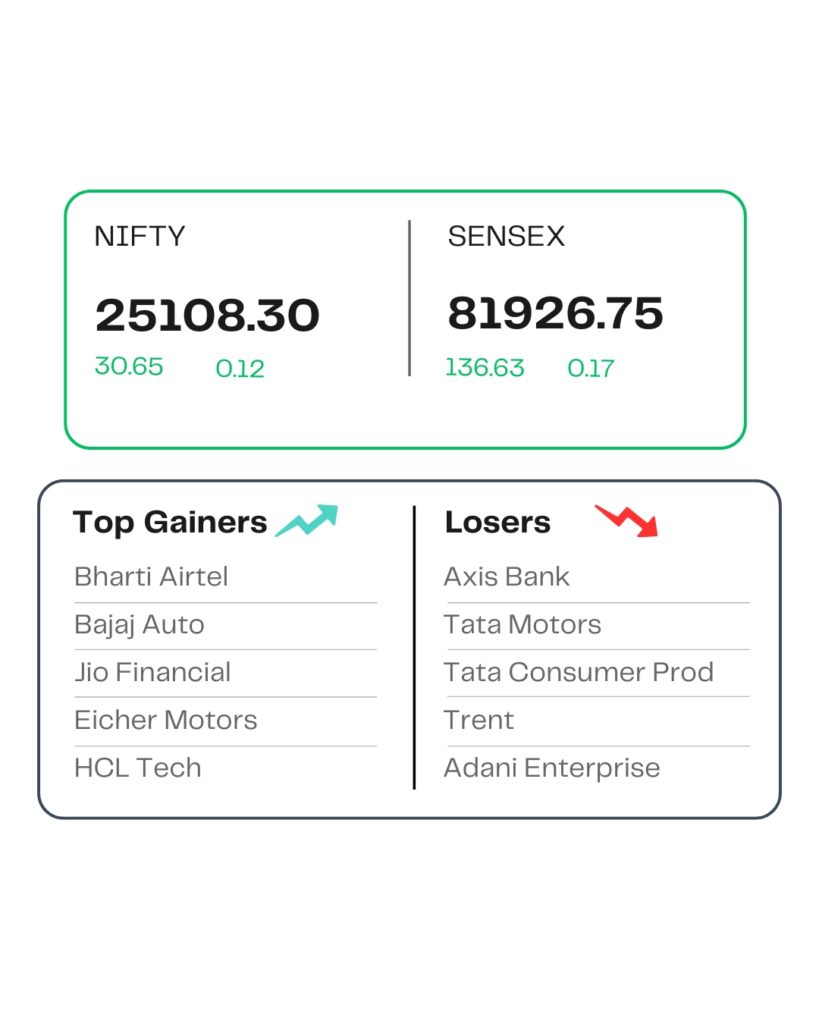 At close, the Sensex was up 136.63 points or 0.17 percent at 81,926.75, and the Nifty was up 30.65 points or 0.12 percent at 25,108.30. About 1780 shares advanced, 2204 shares declined, and 142 shares were unchanged.