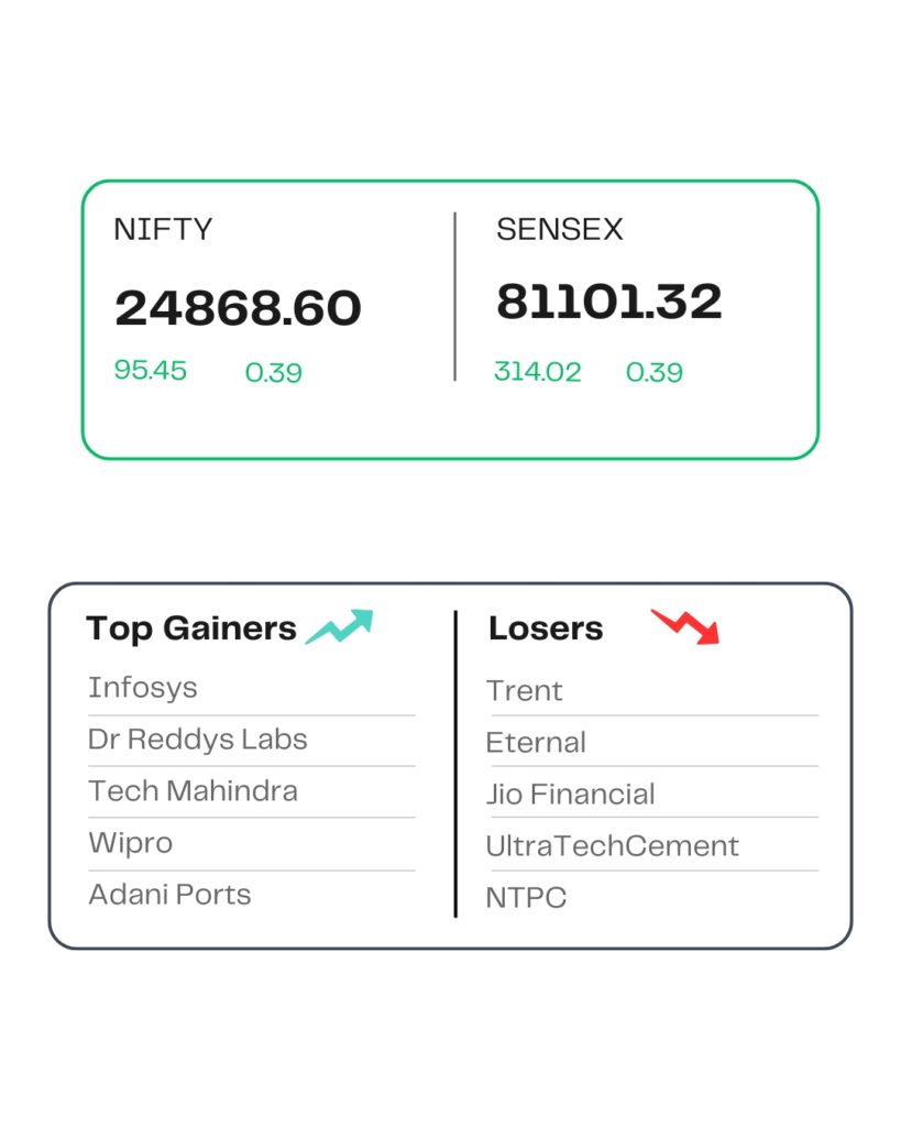 Infosys, Dr Reddy’s Labs, Wipro, Tech Mahindra, Adani Ports were among the major gainers on the Nifty, while losers included Eternal, Trent, Jio Financial, Tata Motors, Titan Company.