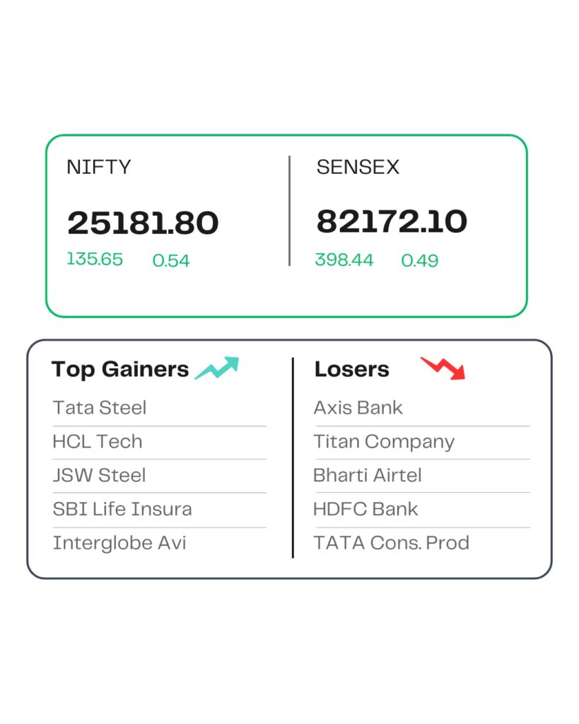 At close, the Sensex was up 398.44 points or 0.49 percent at 82,172.10, and the Nifty was up 135.65 points or 0.54 percent at 25,181.80. About 2015 shares advanced, 1978 shares declined, and 159 shares remained unchanged.