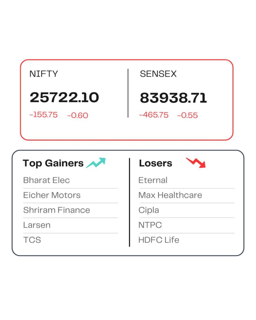 At close, the Sensex was down 465.75 points or 0.55 percent at 83,938.71, and the Nifty was down 155.75 points or 0.60 percent at 25,722.10. About 1731 shares advanced, 2240 shares declined, and 138 shares were unchanged.