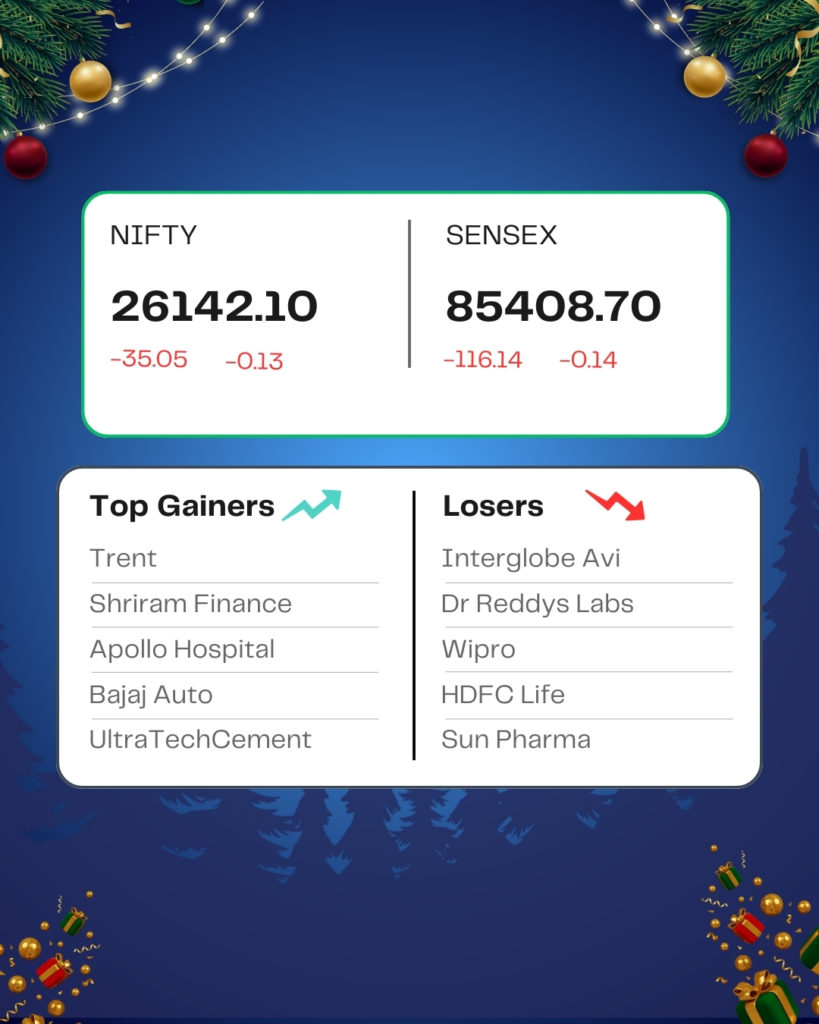 The Indian equity indices ended with marginal losses on December 24, following a volatile trading session marked by muted volumes ahead of the Christmas holiday.