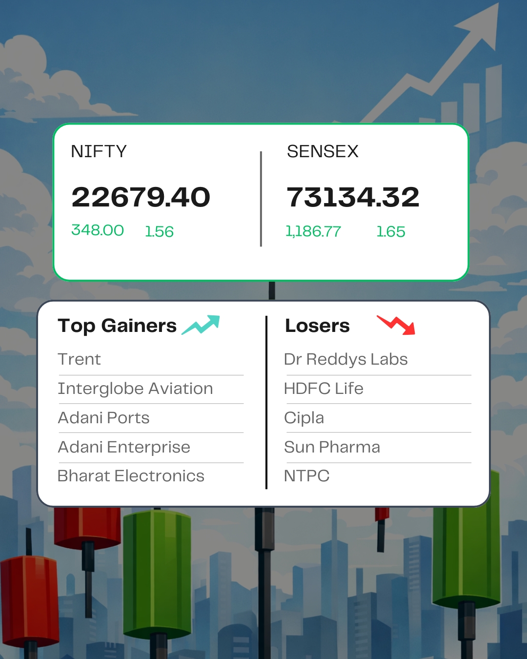 Top gainers – Interglobe Aviation, Adani Ports, Adani Enterprises, Trent, Bharat Electronics Top losers – Dr Reddy’s Labs, HDFC Life, Cipla, NTPC, Sun Pharma.