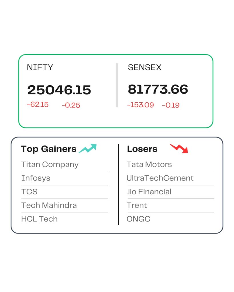 Tata Motors, UltraTech Cement, Jio Financial, ONGC, and Trent were among the major losers on the Nifty, while gainers were Titan Company, Infosys, TCS, Tech Mahindra, and Max Healthcare.