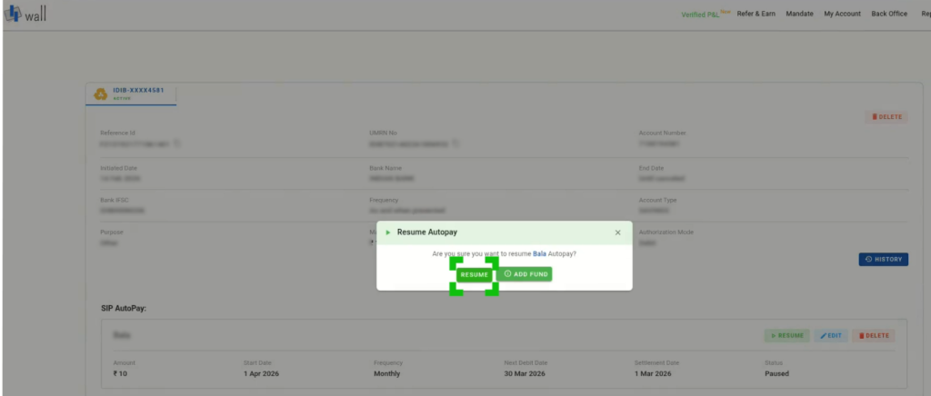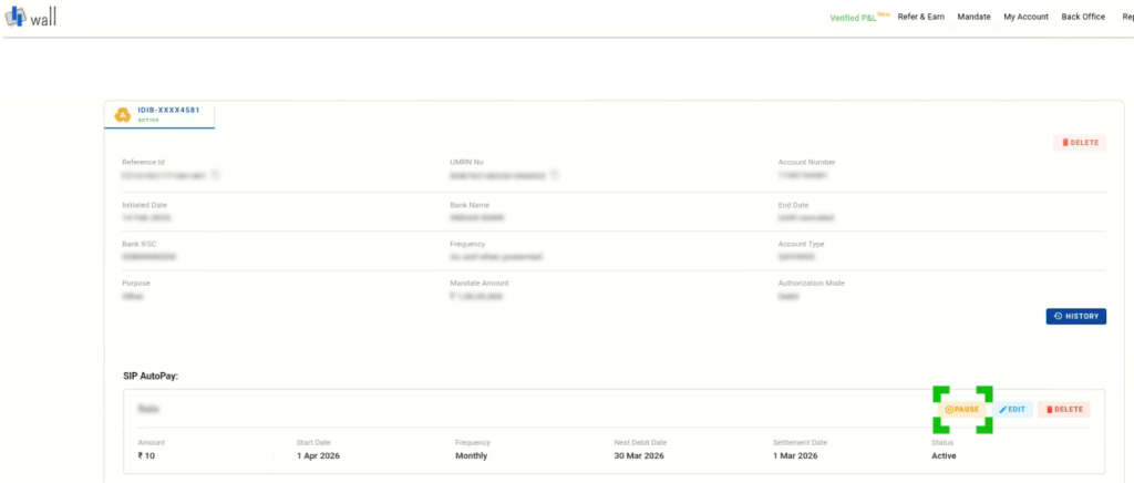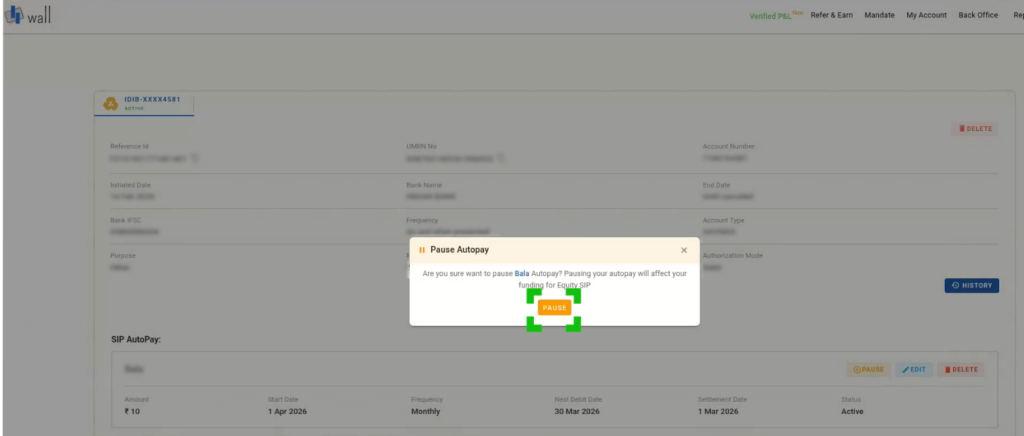 Main Funds E-mandate for equity SIP How to Pause and Resume Autopay? (Step by step process) Print How to Pause and Resume Autopay? (Step by step process) PostedFebruary 18, 2026 UpdatedFebruary 18, 2026 Bythanushaa Log in to the Wall Platform Navigate to the Mandate sectionClick here to view ‘How to set up an autopay?’Click the Pause option on your currently active autopay Click ‘Pause’ to confirm pausing your auto-pay setup. To resume the autopay setup, Click the Resume option on your autopay setup Click ‘Resume’ to confirm resuming your auto-pay setup.